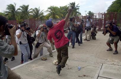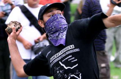 Here's a photograph of an anti-WTO protestor throwing a rock in Cancun.